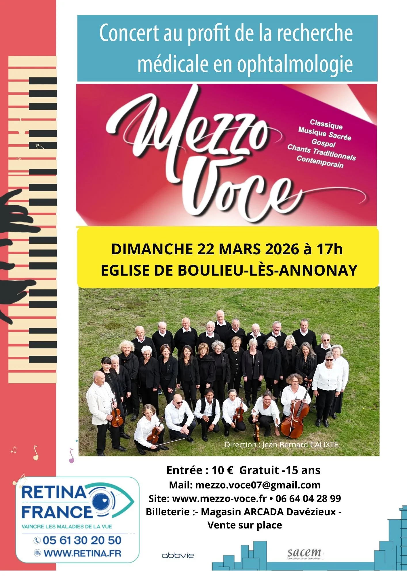Depuis 2013, l’ensemble vocal & instrumental Mezzo-Voce, basé à Davézieux (près d’Annonay en Ardèche), réunit avec passion des chanteurs amateurs expérimentés autour d’un répertoire riche et varié. Classique, baroque, renaissance, gospel ou contemporain, chaque style est interprété avec élégance sous la direction de Jean-Bernard Calixte. Mezzo-Voce s’illustre aussi bien localement en région Rhône-Alpes qu’à l'international (Prague, Italie, Suisse, Espagne). Alliant convivialité et rigueur professionnelle, Mezzo-Voce offre régulièrement des concerts accessibles à un large public.